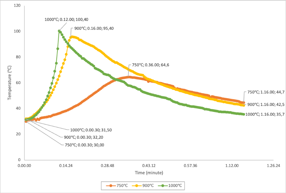 Based on the observation results, in the 1 st 30 s, the initial exothermic temperature of the 3 calcination temperatures was in the range of 30 - 32 °C. The rate of exothermic temperature increase showed that in the 12 th min, the 1000 °C calcination reached a maximum temperature of 100.4 °C, which means that it had reached the boiling point of water. At a calcination temperature of 900 °C, the maximum temperature achieved was 95.45 °C, with an achievement time of 16 min, while the calcination of 750 °C only reached a maximum temperature of 64.60 °C at 36 min. After each calcination reached the highest temperature, the temperature then decreased gradually to reach 35 - 45 °C in 1 h 16 min.