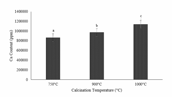 Figure 4 Value of Ca from oyster shells at 750, 900, and 1000 ° C (Error bars represent (n = 3). Different letters (a) - (c) indicate significant differences ( p < 0.05)).