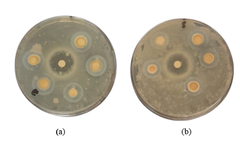 Figure 12 Inhibitory power of oyster shell microbes: (a) E. coli (left); (b) S. aureus (right).