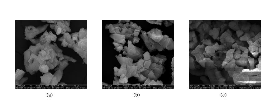 SEM analysis of oyster shell calcination ash revealed notable changes in surface morphology with increasing calcination temperature ( Figure 10 ), reflecting the thermal decomposition of CaCO₃ into CaO. At 750 °C, the ash exhibited a rough, irregular morphology with poorly developed porosity, indicating incomplete decomposition. At 900 °C, the surface became more porous with signs of finer particle aggregation, suggesting further progression of the reaction. At 1000 °C, a more homogeneous and porous structure with smaller particle sizes was observed, attributed to CO₂ release during calcination. Increased porosity enhances the specific surface area and reactivity of CaO. These findings demonstrate that calcination temperature significantly influences the microstructure of oyster shell ash, with higher temperatures yielding a more porous and uniform morphology. Such characteristics are critical for applications in catalysis, adsorption, and the production of calcium-based materials.