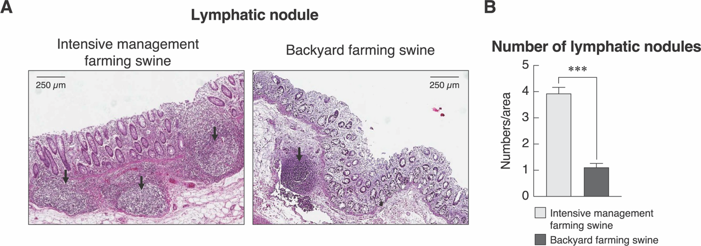 Figure 5 Number of lymphatic nodules in the submucosa of the colon in swine raised under intensive management and backyard farming systems. (A) Histological morphology of the lymphatic nodules (indicated by arrows) observed using a 4× microscope objective. (B) Quantitative comparison of the number of lymphatic nodules between swine raised under intensive management and backyard farming systems, with data presented as mean ± S.E.M. *** p < 0.001, compared between the 2 groups.