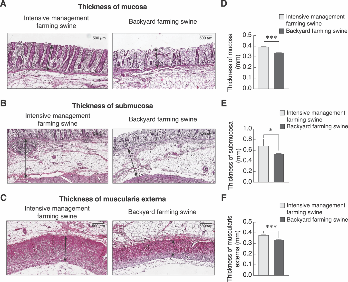 Figure 2 Thickness of the mucosal, submucosal, and muscularis externa layers of the colonic wall in swine raised under intensive management and backyard farming systems. Histological thickness of the mucosa (A), submucosa (B), and muscularis externa (C) in swine raised under intensive management and backyard farming systems. Quantitative comparison of the thickness of the mucosa (D), submucosa (E), and muscularis externa (F) between the 2 groups. Observations were made using a 10× microscope objective. Data are presented as mean ± S.E.M. * p < 0.05, *** p < 0.001, indicating significant differences between the 2 groups.
