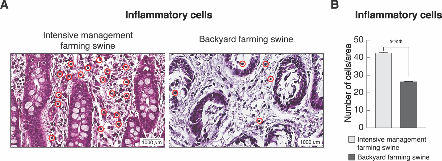 Figure 4 Number of inflammatory cells in the colonic mucosa of swine raised under intensive management and backyard farming systems. (A) Histological morphology of inflammatory cells (indicated by circles) observed using a 40× microscope objective. (B) Quantitative comparison of the number of inflammatory cells between swine raised under intensive management and backyard farming systems. Data are presented as mean ± S.E.M. * p < 0.001, indicating significant differences between the 2 groups.