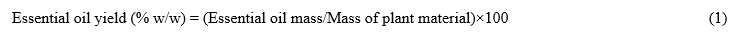 One hundred g of fresh leaf pieces were combined with 200 mL of distilled water in a 1 L round-bottom flask and subjected to hydro-distillation using a Clevenger-type apparatus for 3 - 4 h. After extracting the essential oil, it was dehydrated using anhydrous sodium sulfate, weighed and subsequently stored in amber bottles at 4 °C. The percentage of essential oil yield is determined using Eq. (1) [26].