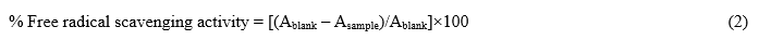 Where A sample indicates the absorbance measured for the mixture of DPPH solution and the sample and A blank indicates the absorbance measured for the DPPH solution and absolute ethanol. The inhibitory concentration (IC 50 ) of the samples was calculated from the linear equation between different sample concentrations and percentage of free radical scavenging activity.