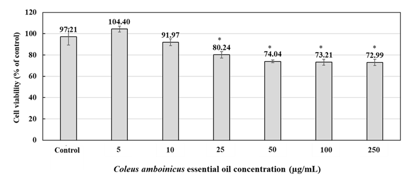 RAW 264.7 macrophage cells were evaluated for the cytotoxicity of essential oil extracts via the 3- (4, 5-dimethylthiazol-2-yl) -2, 5-disphenyltetrazolium bromide (MTT) assay [5,44-45]. RAW 264.7 macrophages were cultivated in Dulbecco’s modified Eagle’s medium (DME medium) supplemented with 10% v/v fetal bovine serum and 1% penicillin/streptomycin, followed by incubation at 37 °C in a 5% CO 2 atmosphere for 24 h. The 5×10 4 cells were inoculated into each well of a 96-well plate. The cells were cultured with 1,000 µL of essential oil concentrations of 5, 10, 25, 50, 100 and 250 µg/mL, formulated with 0.0025% Tween 20, at 37 °C in a 5% carbon dioxide atmosphere for 24 h. The old cell culture media was removed, and the cells were washed with phosphate-buffered saline (pH 7.4). One thousand µL of mixture solution comprising 200 µL of 0.5% MTT solution mixed with 800 µL of cells culture medium was added to each well, followed by incubation at 37 °C for 2 h. After 2 h, the culture broth medium was removed. Prior to measuring the absorbance at 570 nm using a microplate reader, 500 μL of DMSO was added to each well to solubilize the blue formazan crystal product. Tween 20 (0.00025%) served as the control group (vehicle control). The amount of formazan is directly related to the count of active mitochondria in a living cell. The percentage of cell viability was subsequently estimated in relation to the control group (untreated cells) using Eq. (3).