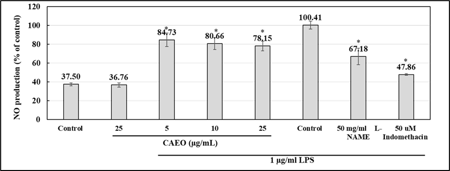 Figure 6 The inhibitory effect of C. amboinicus Lour. essential oil on NO production in LPS-stimulated RAW 264.7 macrophages. The presented data shows the mean of 3 replicates ± S.D. with * denoting a statistically significant difference ( p < 0.05) relative to the untreated group. Control = Medium, CAEO = C. amboinicus Lour. essential oil, LPS = Lipopolysacchari, L-NAME = nitro-L-arginine methyl ester.