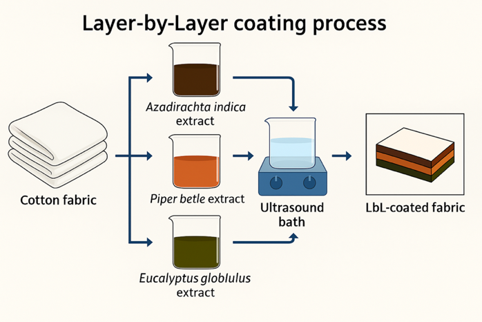 Figure 5 represents the Layer-by-Layer (LbL) coating approach used to enhance the multifunctionality of cotton fabrics through sequential deposition of plant extracts, including Azadirachta indica (Neem), Piper betle and Eucalyptus globulus.