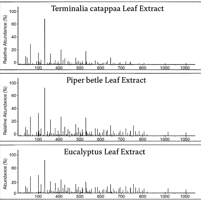 For T. catappa and P. betle, decoction was employed: 10 g of leaf powder was boiled in 200 mL of distilled water for 45 min under continuous stirring at 90 - 95 °C.