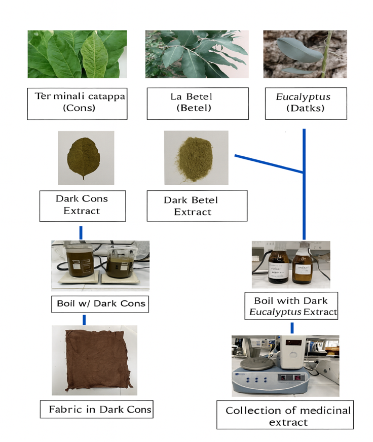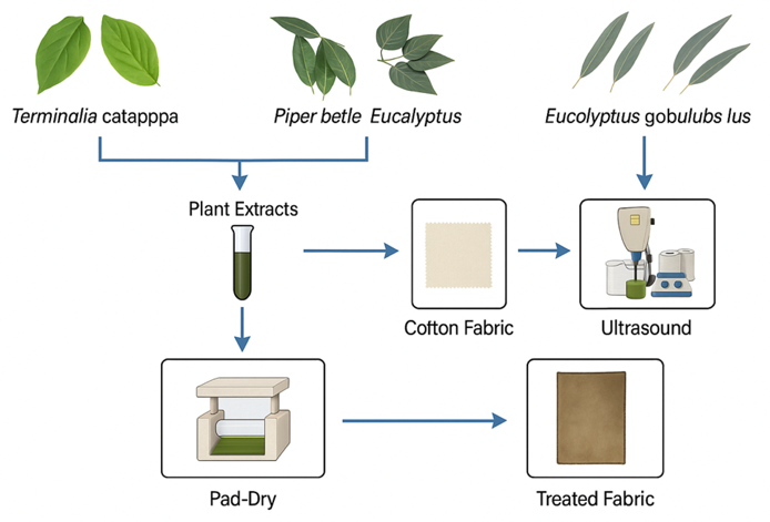 Figure 2 illustrates the detailed stepwise procedure for the preparation, extraction, and application of plant-based extracts derived from the leaves of Terminalia catappa, Piper betle and Eucalyptus globulus onto cotton fabrics to confer functional properties. The technical workflow includes the following key steps.