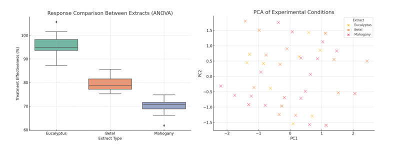 Figure 8 (a) Comparison of antibacterial treatment effectiveness (%) of cotton fabrics incorporated with Eucalyptus globulus , Piper betle , and Swietenia mahagoni extracts via ANOVA analysis. (b) PCA plot demonstrates clear separation between extract groups based on bio-response of the treated cotton fabrics.