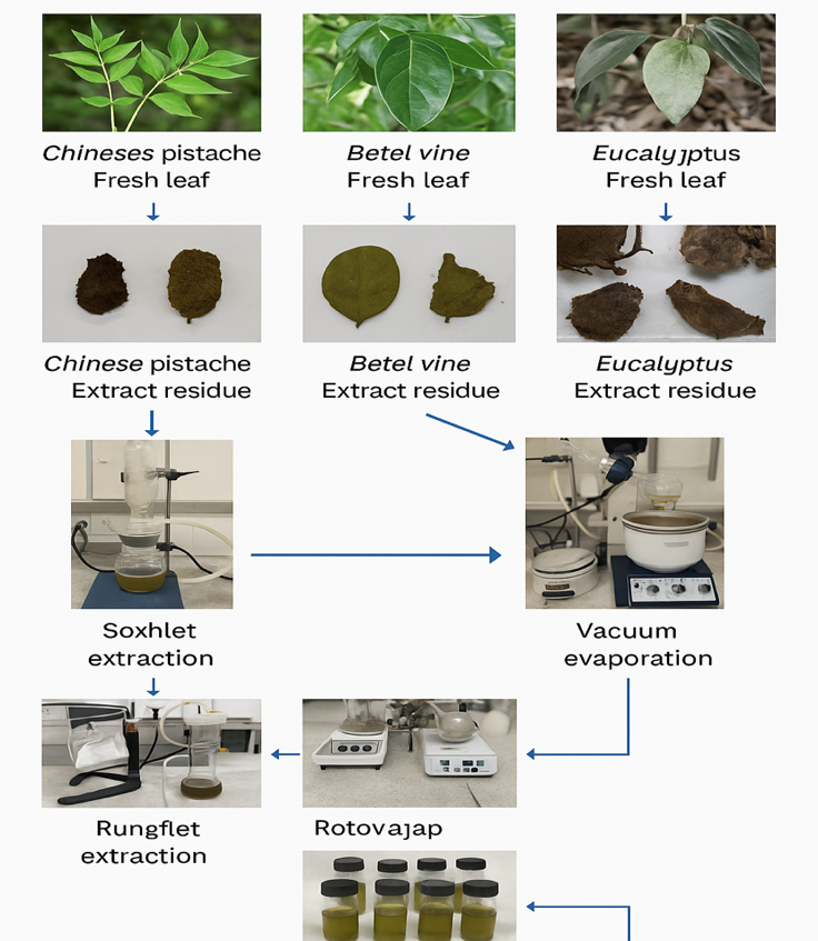 Figure 1 Extraction and Isolation Process of Plant Extracts from Pistacia chinensis, Piper betle and Eucalyptus globulus.
