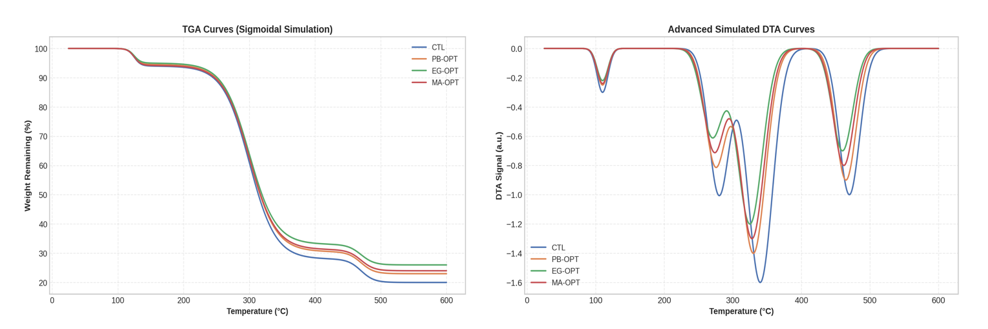 The DTA curves further support this enhancement. While the CTL sample showed a pronounced exothermic peak at ~330 °C, the treated samples displayed smaller, more shifted peaks ranging from 335 °C to ~350 °C, suggesting less intense and more controlled degradation behavior. Notably, the EG-OPT sample exhibited two distinct DTA transitions with reduced amplitude, reflecting a more stable thermal profile and moderated decomposition kinetics.