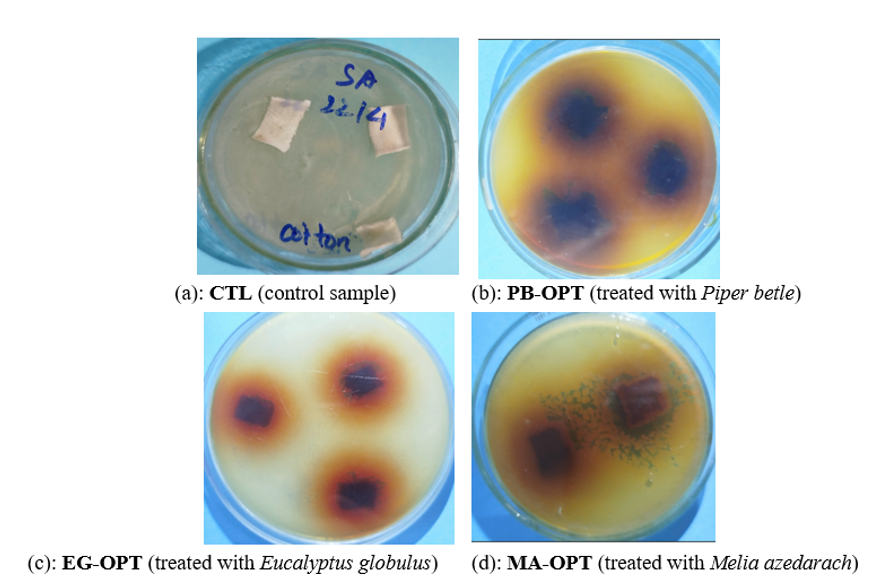 Figure 11 Antibacterial activity of cotton samples against Staphylococcus aureus after treatment with different plant extracts: (a) CTL (control), (b) PB-OPT (Piper betle), (c) EG-OPT (Eucalyptus globulus) and (d) MA-OPT (Melia azedarach).