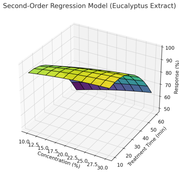 The 3D plots visually represent the nonlinear relationships between extract concentration, treatment time and antibacterial performance. For all extracts, increasing both parameters generally enhanced antibacterial efficiency, suggesting a synergistic interaction. Notably, the second-order model for Eucalyptus globulus displays a peak response followed by a slight decline beyond the optimal threshold, likely due to saturation or thermal degradation of active phytochemicals.
