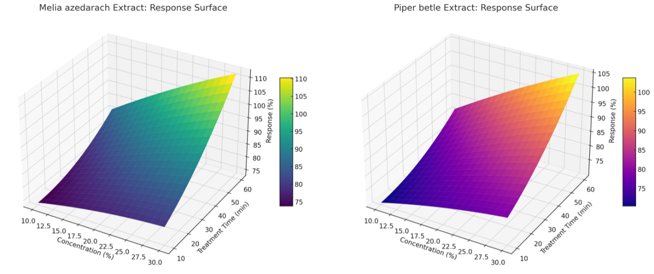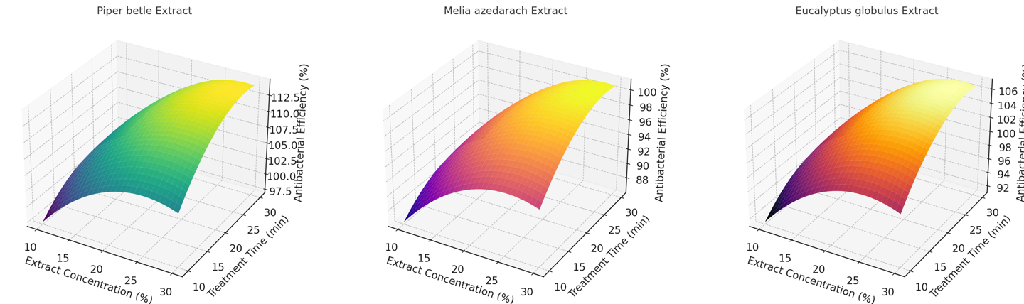 Figure 7 shows the 3D response surface plots describing the relationship between extract concentration (%), treatment time (min) and antibacterial efficiency (%) for three types of plant extracts: Piper betle, Melia azedarach and Eucalyptus globulus. The plots reveal that increasing both the extract concentration and treatment time generally leads to improved antibacterial activity. However, the effectiveness tends to plateau or slightly decline beyond certain thresholds, likely due to saturation effects or thermal degradation of active compounds.