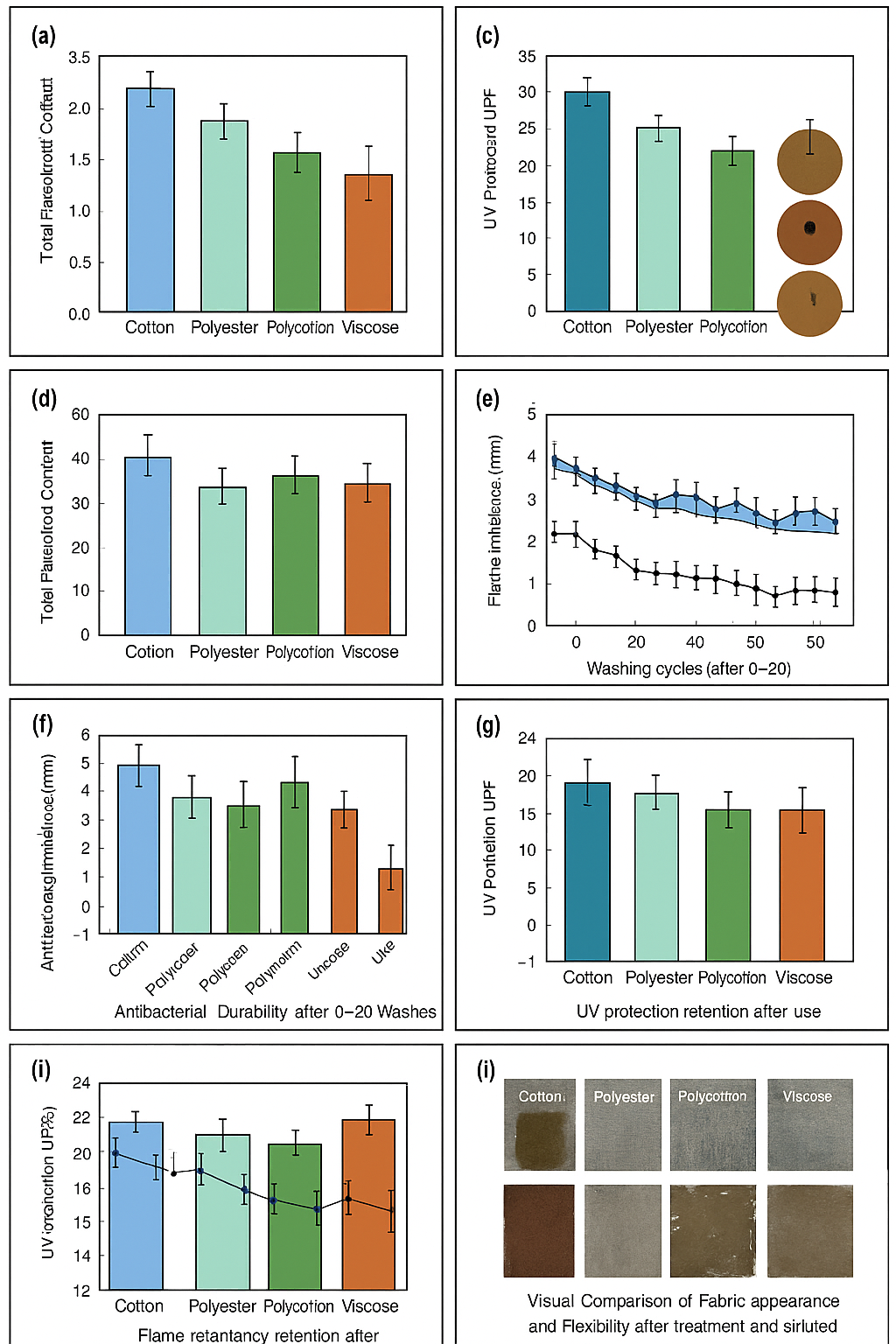 Figure 19 Comparative Evaluation of Treated Fabrics (Cotton, Polyester, Polycotton, Viscose): (a) Total polyphenol content; (b) Total flavonoid content; (c) UV protection efficiency (UPF); (d) Antibacterial inhibition zones; (e) Flame retardancy (LOI%); (f) Antibacterial durability after 0–20 washes; (g) UV protection retention after washing cycles; (h) Flame retardancy retention post-washing; (i) Visual comparison of fabric appearance and flexibility after treatment and simulated use.