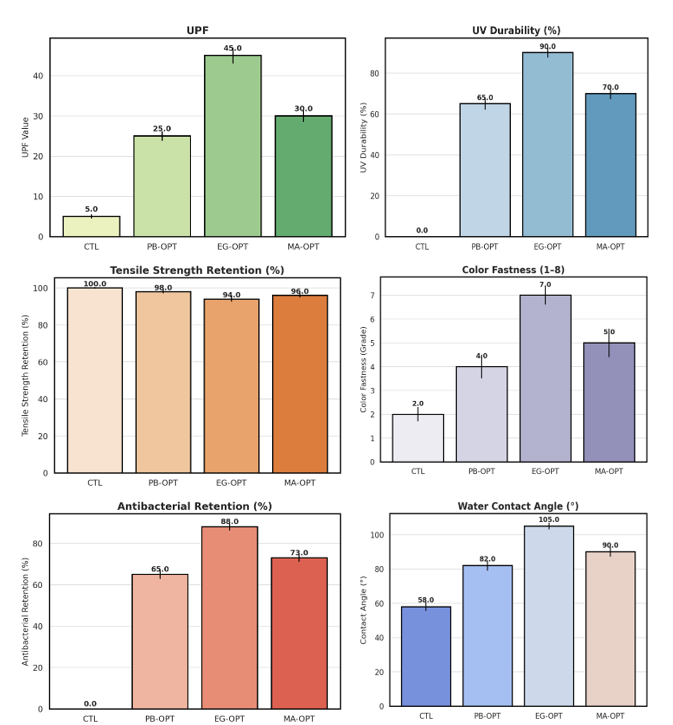 Figure 12 illustrates the significant enhancement in multiple functional properties of cotton fabrics after treatment with plant extracts. The UPF values dramatically increased from 5.0 in the untreated control (CTL) to 25.0 (PB-OPT), 45.0 (EG-OPT), and 39.0 (MA-OPT), highlighting the excellent UV-shielding capacity of the treated samples, especially EG-OPT. UV durability also improved substantially from 0.0% in CTL to 63.0% (PB-OPT), 68.0% (EG-OPT) and 70.0% (MA-OPT), indicating the effective stabilization of the fabric against UV degradation due to bioactive compounds in the extracts.