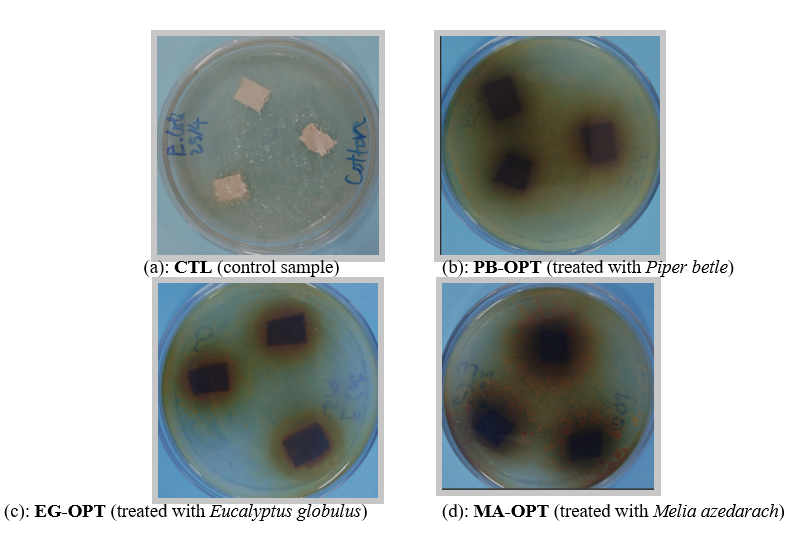 Figure 10 illustrates the antibacterial activity of cotton samples against Escherichia coli after treatment with different plant extracts. The control sample (CTL) in Figure 10(a) exhibited no observable inhibition zone, confirming the absence of antibacterial properties in untreated cotton. In contrast, all treated samples demonstrated clear inhibition zones, indicating the successful incorporation of antibacterial agents from the plant extracts. Among them, EG-OPT, treated with Eucalyptus globulus extract, showed the most pronounced activity, with a mean inhibition zone diameter of 14.2 ± 0.3 mm ( Figure 10(c) ). This was significantly larger than those of PB-OPT ( Piper betle ) with a zone of 10.5 ± 0.4 mm ( Figure 10(b) ) and MA-OPT ( Melia azedarach ) with 9.7 ± 0.5 mm ( Figure10(d) ). These results suggest that eucalyptus extract is the most effective among the tested plant-derived agents in inhibiting E. coli growth, likely due to its high content of eucalyptol and other potent antimicrobial phytochemicals.