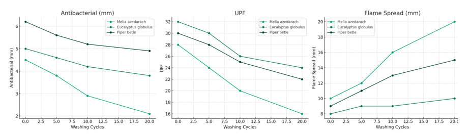 The chart illustrates the durability of antibacterial, UV-protective and flame-retardant properties of fabric samples treated with three different plant extracts (Melia azedarach, Eucalyptus globulus, and Piper betle) after ISO-standard washing cycles (0, 5, 10 and 20 times). In terms of antibacterial activity, Piper betle retained the highest effectiveness, with the inhibition zone decreasing slightly from 6.2 mm to 4.9 mm after 20 washes. Eucalyptus globulus also maintained moderate stability (from 5.0 mm to 3.8 mm), whereas Melia azedarach showed a more significant reduction from 4.5 mm to just 2.1 mm. Regarding UV protection, Eucalyptus globulus achieved the highest UPF values (dropping from 32 to 24), followed by Piper betle (30 to 22) and Melia azedarach (28 to 16), indicating a gradual yet notable decline in UV resistance. For flame retardancy, Eucalyptus globulus again exhibited the best performance with minimal increase in flame spread (from 8 mm to 10 mm). Piper betle showed a moderate rise (9 mm to 15 mm), while Melia azedarach exhibited the greatest degradation (10 mm to 20 mm). These findings suggest that Eucalyptus globulus offers the most stable multifunctional durability after laundering, whereas Piper betle excels in antibacterial effectiveness (See Figure 18 ). Although Piper betle has been widely reported for its strong antimicrobial properties, the present results show that Eucalyptus globulus exhibited the highest initial inhibitory effect against both E. coli and S. aureus (inhibition zone ~ 6.2 mm). The difference can be explained by the higher concentration and diversity of bioactive phytochemicals in Eucalyptus leaves, particularly eucalyptol, phenolic acids and flavonoids, which can disrupt bacterial membranes more effectively. Piper betle, while rich in eugenol and tannins, demonstrated relatively lower initial inhibition (~5.5 mm) but exhibited better retention after repeated washing, with antibacterial zones decreasing more gradually compared with Eucalyptus. This indicates that Eucalyptus extract provides stronger immediate antibacterial efficacy, whereas Piper betle contributes to greater durability of antibacterial properties over multiple washing cycles. The complementary characteristics of these extracts highlight the importance of phytochemical composition and binding affinity to cotton fibers in determining both the strength and stability of antibacterial functionality.