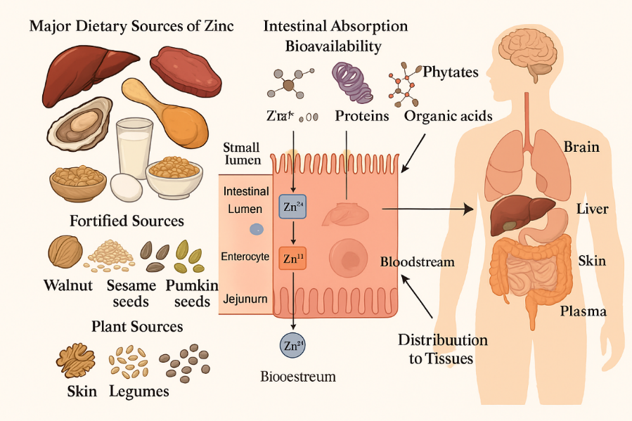 After entering the bloodstream, zinc is widely distributed, with approximately 85% stored in skeletal muscle and bone, and smaller fractions present in skin, liver, brain, and plasma [25]. At the cellular level, zinc functions as an enzyme cofactor, a structural stabilizer of proteins, and an intracellular signaling molecule that regulates diverse metabolic pathways [33]. The coordinated expression of ZIP and ZnT transporters, which varies across tissues according to zinc status, is central to maintaining systemic zinc balance [34]. Figure 1 provides a schematic overview of dietary sources, intestinal absorption mechanisms, and factors affecting zinc bioavailability.