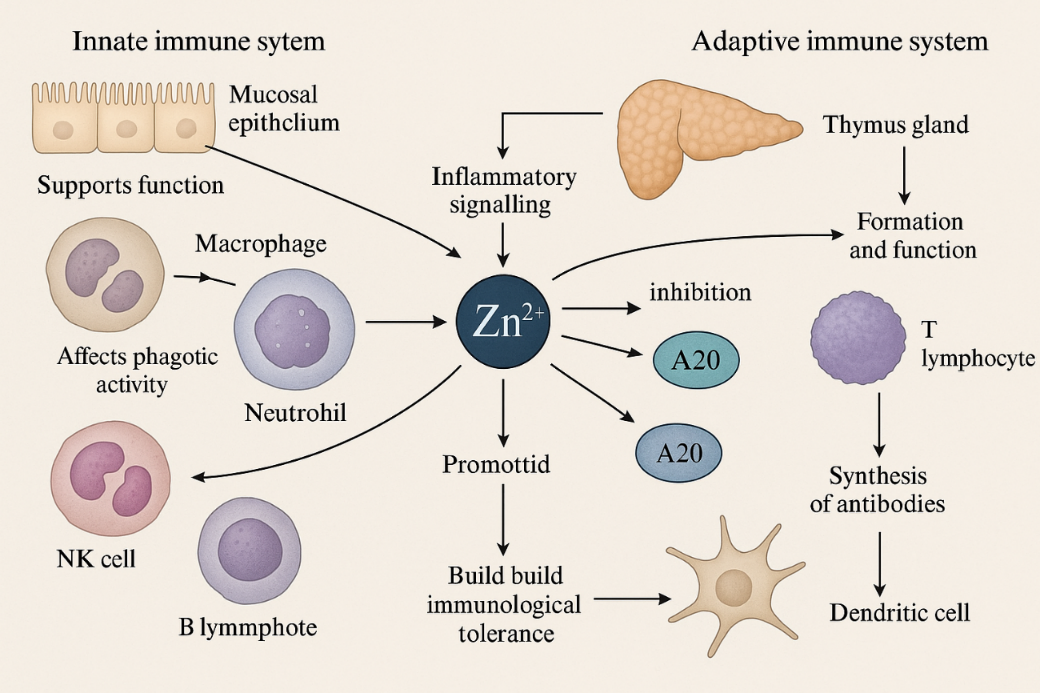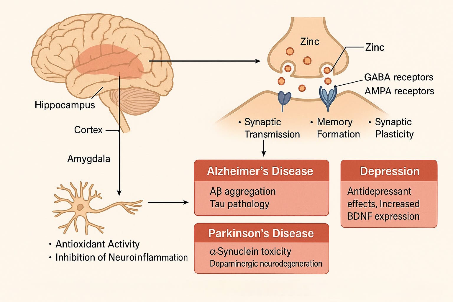 While deficiency remains a major concern, excessive intake - typically exceeding 40 mg/day - may also be detrimental, leading to gastrointestinal disturbances, immune dysregulation, and impaired copper absorption [17]. Beyond deficiency and toxicity, zinc plays a central role in modulating oxidative stress and inflammation, with relevance to chronic diseases such as diabetes mellitus, cardiovascular disease, neurodegeneration, and cancer [18]. Recent research highlights its immunomodulatory and antiviral properties, including the regulation of T lymphocytes, NK cells, and macrophages [19], as well as its potential role in reducing viral replication in COVID-19 [20]. Furthermore, zinc may contribute to the maintenance of cognitive function and delay neurodegenerative progression in conditions such as Alzheimer’s and Parkinson’s disease, although current evidence supports association rather than causality [18,20].