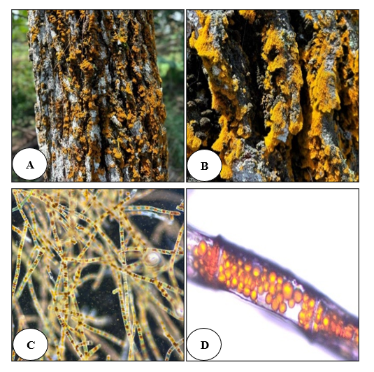 Figure 1 Morphology of T. aurea: (A) Trees covered with massive growth of T. aurea; (B) Population of T. aurea on the tree bark; (C) T. aurea filaments observed under 100× magnification; (D) Carotenoid pigments in T. aurea filaments observed under 400× magnification. (C) and (D) were captured using an Olympus CX43 microscope equipped with a DP75 camera and CellSens Dimensions software.