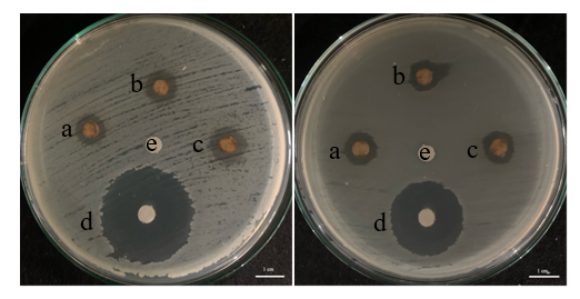 Figure 2 Inhibition zones of methanol extract of T. aurea against bacteria: (A) Gram-positive bacteria S. aureus (a) - (c). Replicates of methanol extract of T. aurea; (d) Positive control (Chloramphenicol); (e) Negative control (Dimethyl sulfoxide)), and (B) Gram-negative bacteria S. enterica serovar Typhii (a) - (c). Replicates of methanol extract of T. aurea; (d) Positive control (Chloramphenicol); (e) Negative control (Dimethyl sulfoxide).