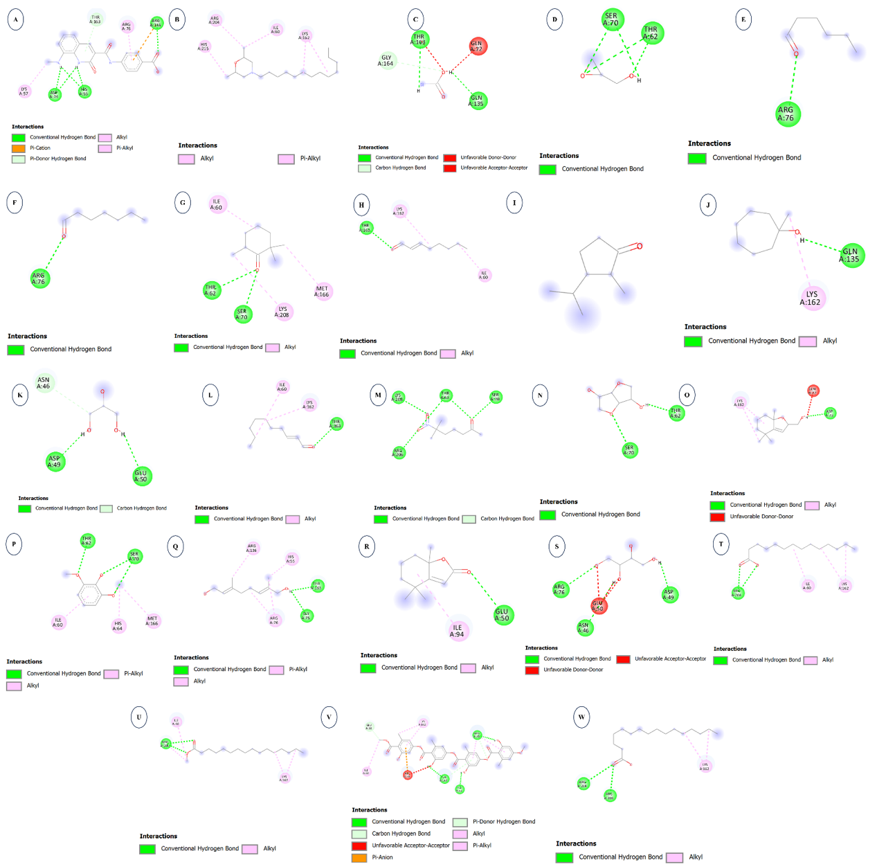 Figure 6 2D interactions of 4-[[8-(methylamino)-2-oxidanylidene-1~{H}-quinolin-3-yl]carbonylamino]benzoic acid9 (Control) and bioactive compounds from T. aurea (Linnaeus) C.Martius against the 6KZZ protein. (A) 4-[[8-(methylamino)-2-oxidanylidene-1~{H}-quinolin-3-yl]carbonylamino]benzoic acid9; (B) Morpholine, 2,6-dimethyl-4-tridecyl-, (z)-; (C) Carbamic acid, monoammonium salt; (D) Oxiranemethanol; (E) Hexanal; (F) Heptanal; (G) Cyclohexanone, 2,2,6-trimethyl-; (H) Cyclohexanol, 3,5-dimethyl-; (I) 2 octenal; (J) Cyclopentanone, 2-methyl-3-(1-methylethyl)-; (K) 1-methylcycloheptanol; (L) 1,2,3-propanetriol; (M) 2-decenal, (e)-; 6-methyl-6-nitro-2-heptanone; (O) Isosorbide; (P) 2-Benzofuranmethanol, 2,4,5,6,7,7a-hexahydro-4,4,7a-trimethyl-, cis-; (Q) Phenol, 2,6-dimethoxy; (R) 8-hydroxygeraniol; (S) 2(4H)-Benzofuranone, 5,6,7,7a-tetrahydro-4,4,7a-trimethyl-; (T) 1,2,3,4-tetrahydroxybutane; (U) Tetradecanoic acid (V) Hexadecanoic acid, methyl ester (X) Aphthosin; (Y) Hexadecanoic acid.