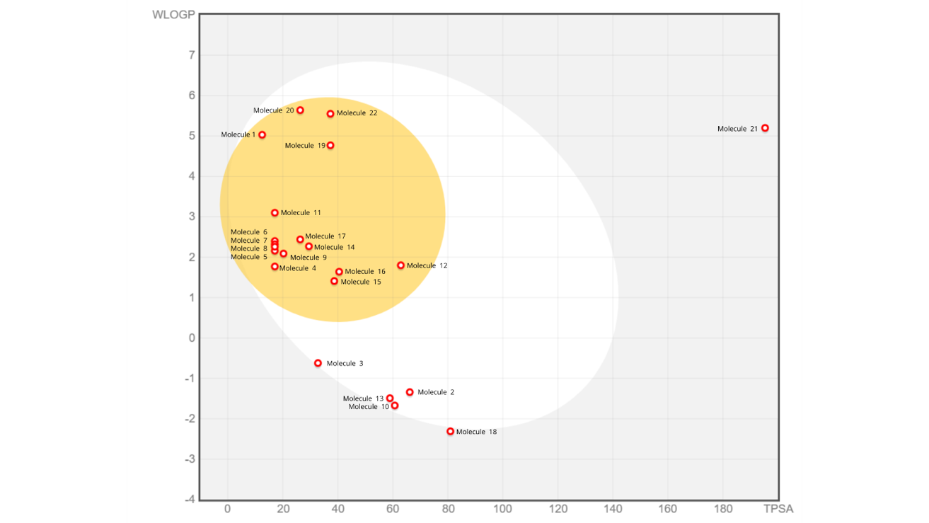 Lipinski’s rule of 5 was utilized to assess the degree to which the compounds mimicked the properties of drugs. All the compounds were evaluated using SwissADME (http://www.swissadme.ch/), which is a drug-likeness evaluation framework. The number of hydrogen bond acceptors and donors, the molecular weight, and the bioavailability of the molecule are some of the parameters that are included in this resource. It is possible to determine the oral bioavailability of a compound with the help of Lipinski’s rule of 5.