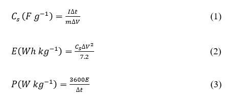 Where Δt is the discharge duration (in s), I is the electric current applied during the discharge process (in amperes), m refers to the mass of electroactive material coated on the substrate (in g) and ΔV indicates the operating voltage range or potential window (in V).