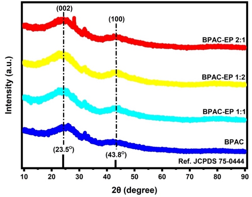 XRD analysis was conducted to study the crystalline and amorphous characteristics of BPAC and BPAC-EP at various ratios (1:1, 1:2 and 2:1) as shown in Figure 2. The XRD diffraction patterns of all samples showed a dominant amorphous nature, characterized by broad peaks around 2θ = 20° - 30° and 40° - 50°, respectively, associated with the (002) and (100) planes of the graphitic structure. However, a sharp peak was detected at an angle of 30 - 35, which was associated with residual ash from the activation process using NaOH [35]. The peak intensity of BPAC-EP varied based on the enzyme ratio used, with BPAC-EP 2:1 showing the highest intensity, indicating a possible increase in the degree of local order, although the overall structure remained amorphous. The diffraction patterns of BPAC, BPAC-EP 1:1, BPAC-EP 1:2 and BPAC-EP 2:1 powders were 84%, 86%, 88% and 89%, respectively. The XRD patterns of BPAC-EP samples varied depending on the enzyme ratio, with BPAC-EP 2:1 showing the highest peak intensity, indicating a possible increase in the degree of local order, although the overall structure remained amorphous. Notably, the XRD pattern was in agreement with the JCPDS 75-0444 reference data for activated carbon, confirming the amorphous nature of the material. The absence of sharp peaks in all samples confirmed the lack of long-range crystallinity, supporting previous findings on the significant role of amorphous structures in facilitating efficient ion diffusion in biomass-based carbon materials [36,37].