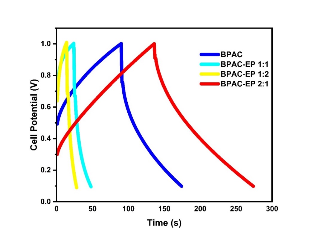 The electrodes were composed of a mixture of activated carbon, carbon black and PVDF in a mass ratio of 85:10:5, which was then dissolved in NMP to form a homogeneous suspension. This mixture was coated on an aluminum substrate using a Doctor Blade Coating Machine (TOB Energy) and dried at 80 °C. After that, the electrodes were kept in a vacuum oven at 50 °C for 24 h to ensure complete solvent removal. In the 2-electrode configuration, 2 symmetrical disc-shaped electrodes with a diameter of 1.5 cm were prepared using the same procedure. Both electrodes were then arranged face to face with Whatman filter paper as a separator. The coin cell assembly process was completed by adding electrolyte in the form of 1 M Na2SO4 solution. Electrochemical characterization of BPAC and BPAC modified with papain enzyme (BPAC-EP) samples was carried out using Gamry Potentiostat for Cyclic Voltammetry (CV) and Electrochemical Impedance Spectroscopy (EIS) tests and Neware Battery Tester for Galvanostatic Charge-Discharge (GCD) analysis. CV tests were carried out at incremental scan rates of 10, 20, 50 and 100 mV/s, while a fixed current density of 0.1 A/g was used for GCD tests. EIS tests were carried out with a root mean square (RMS) signal amplitude of 10 mV in the frequency range between 100 kHz and 0.1 Hz. Electrode performance parameters, such as specific capacitance (Cs), energy density (E) and power density (P), were determined based on GCD data using the following equations: