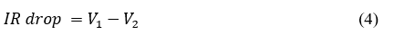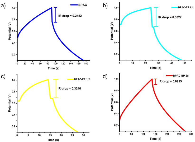Voltage drop due to internal resistance (IR drop) is a phenomenon of sudden voltage reduction that occurs right after the charging process ends and the discharge process begins [24,25]. This phenomenon occurs due to the accumulation of total resistance in the supercapacitor system, which includes the resistance of the electrodes, electrolytes and internal connections of the device [26]. The large value of IR drop reflects the high internal resistance, which generally has a negative impact on the performance of the supercapacitor because it inhibits the efficiency of charge transfer and reduces the output power [27,28]. The value of IR drop can be calculated from the difference between the voltage at the end of charging (V1) and the initial voltage when the discharge begins (V2), as expressed in the following equation: