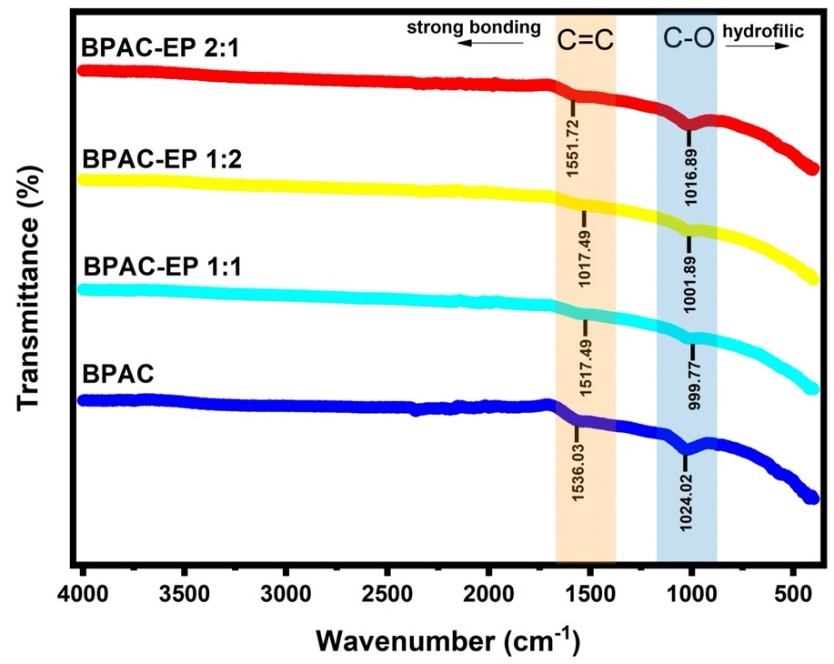 FTIR was used to identify functional groups in BPAC and BPAC-EP (Figure 1). The FTIR spectrum of BPAC showed 2 characteristic peaks, namely at 1,536.03 cm−1 associated with aromatic C = C stretching vibrations and at 1,024.02 cm−1 related to C–O stretching, possibly originating from alcohol, ether, or carboxylic acid groups. After being modified with papain, the spectrum of BPAC-EP showed significant changes, marked by the emergence of new peaks at 1,551.72 cm−1 (BPAC-EP 2:1) and 1,016.89 cm−1 (BPAC-EP 1:1 and 1:2), indicating C–N stretching of the amide group, indicating the involvement of papain in surface modification. Comparison between the spectra of BPAC and BPAC-EP confirmed that papain successfully modified the chemical composition of the activated carbon surface. The presence of –OH groups, associated with C–O stretching, plays an important role in improving electrochemical properties by improving surface wettability, facilitating access of electrolyte ions and increasing charge storage capacity [29,30]. Overall, effect enzyme papain increases the concentration of oxygen groups on the carbon surface, which has a positive impact on electrochemical performance [32-34].