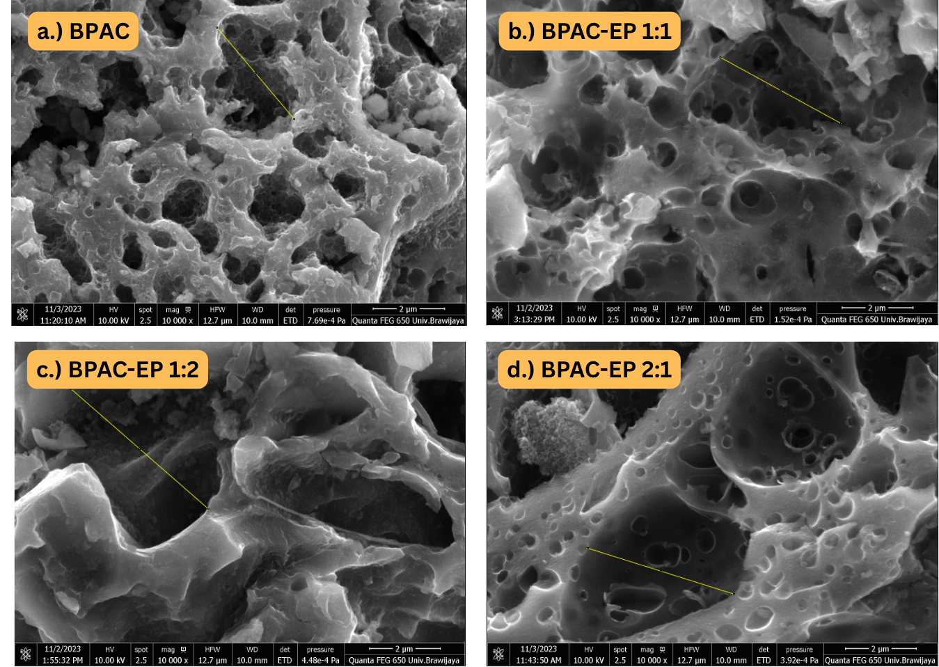 Figure 3(a) BPAC SEM shows the irregular and grooved surface, with heterogeneous morphology. The rough surface is filled with many pores and various shapes and sizes [23]. The surface structure of BPAC-EP 1:1 (Figure 3(b)) is generally similar to pure BPAC, which is rough and porous, with heterogeneously distributed voids. The surface of the activated carbon aggregate still looks rough and textured, characterizing the typical irregular surface of activated carbon [40]. In BPAC-EP 1:2 (Figure 3(c)), more significant changes in surface morphology are seen. The surface looks layered, cracked and fragmented, not as regular as the pure sample. The visible pores tend to be rarer but larger in size (macropores). This indicates that some large pores appear or merge, while small pores are hidden or closed. This phenomenon is similar to the filling of pores by adsorbates after the administration of papain enzyme, showing that some pores are filled (closed), only macro pores remain on the surface.