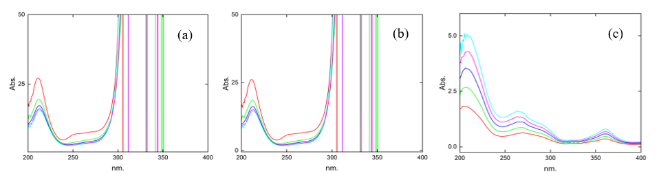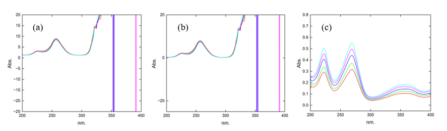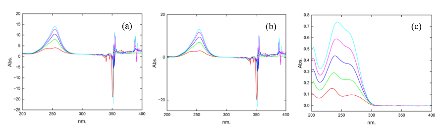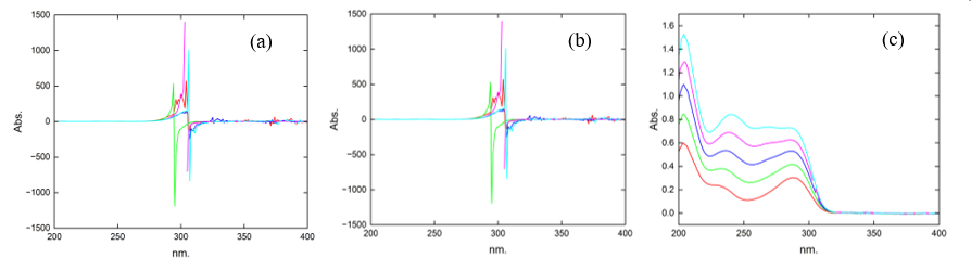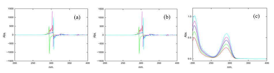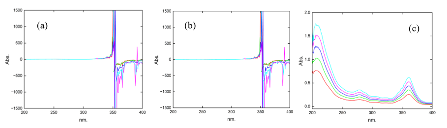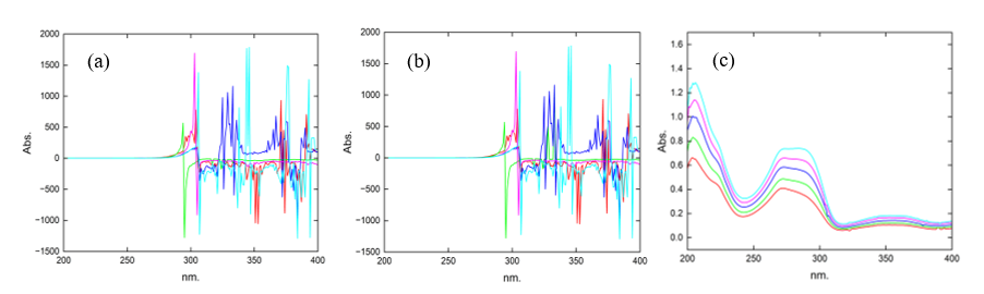 Figure 13 Spectra of the mixture of with (a) B2 as the divisor 22 µg.mL–1, (b) spectra subtracting the constant (B2/B2°), and (c) spectra after multiplying by the divisor.