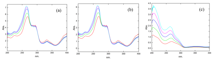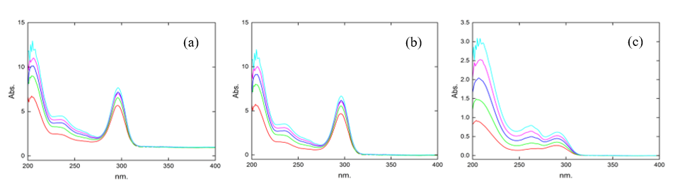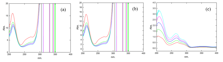 To facilitate the analysis of B1, B2, B3, B6, and B12, standard solutions with different concentration levels were prepared from the working solutions, ranging from 4 to 20 µg.mL–1 for vitamin B1, 16 to 28 µg.mL–1 for B2, 6 to 30 µg.mL–1 for B3, 7.5 to 15.5 µg.mL–1 for B6, and 15 to 35 µg.mL–1 for B12. These calibration solutions were subsequently analyzed using a UV-Visible spectrophotometer, with spectral data recorded in the 200 - 400 nm wavelength range. This procedure enabled the identification of characteristic absorption maxima for each vitamin, forming the basis for subsequent quantitative evaluations.