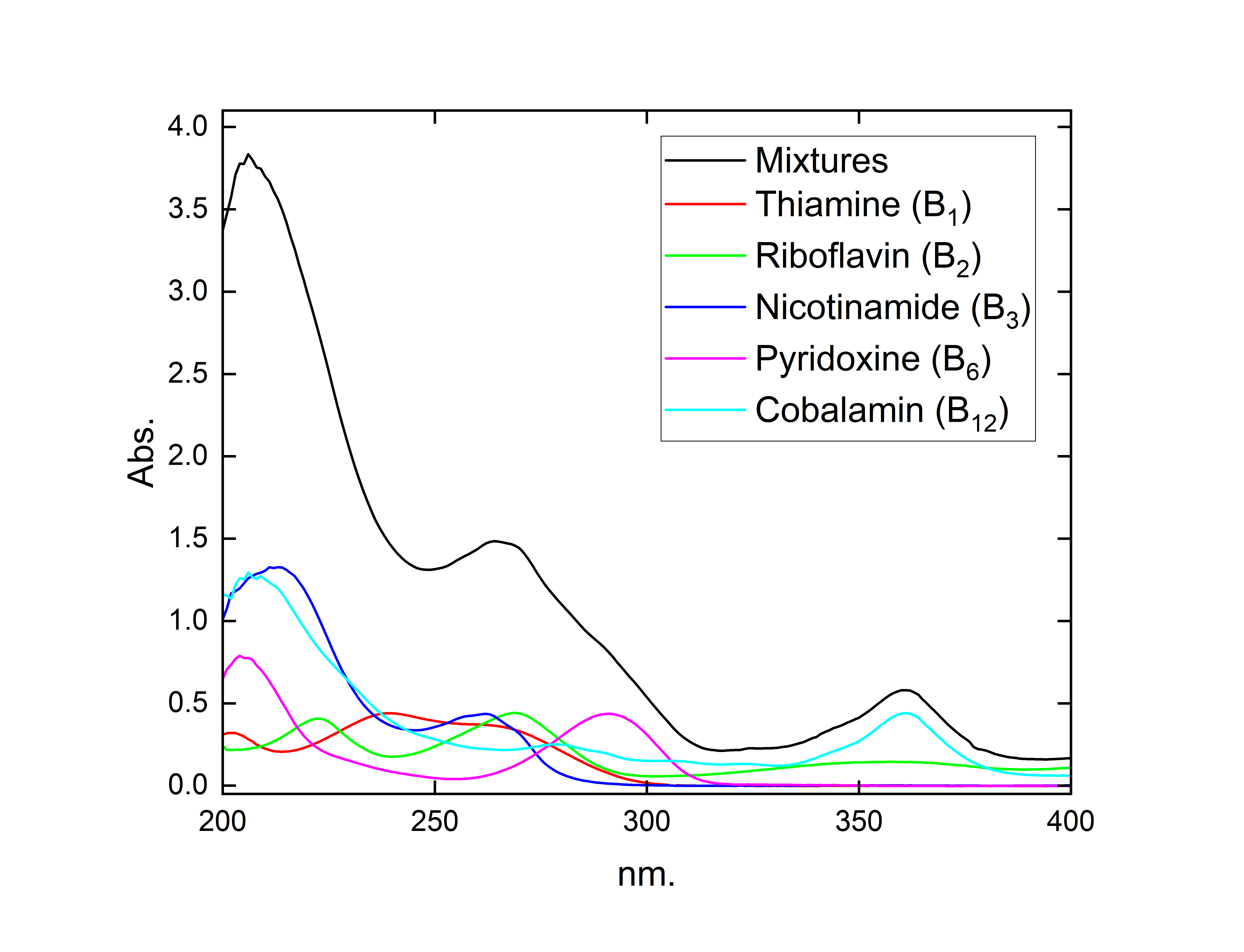 Absorption spectra of individual B1, B2, B3, B6, and B12, as well as their mixtures, were obtained