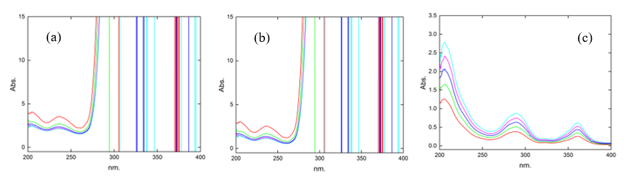 Figure 2 Spectra of the mixture with (a) B12 as the divisor 25 µg.mL–1, (b) spectra subtracting the constant (B12/B12°), and (c) spectra after multiplying by the divisor.