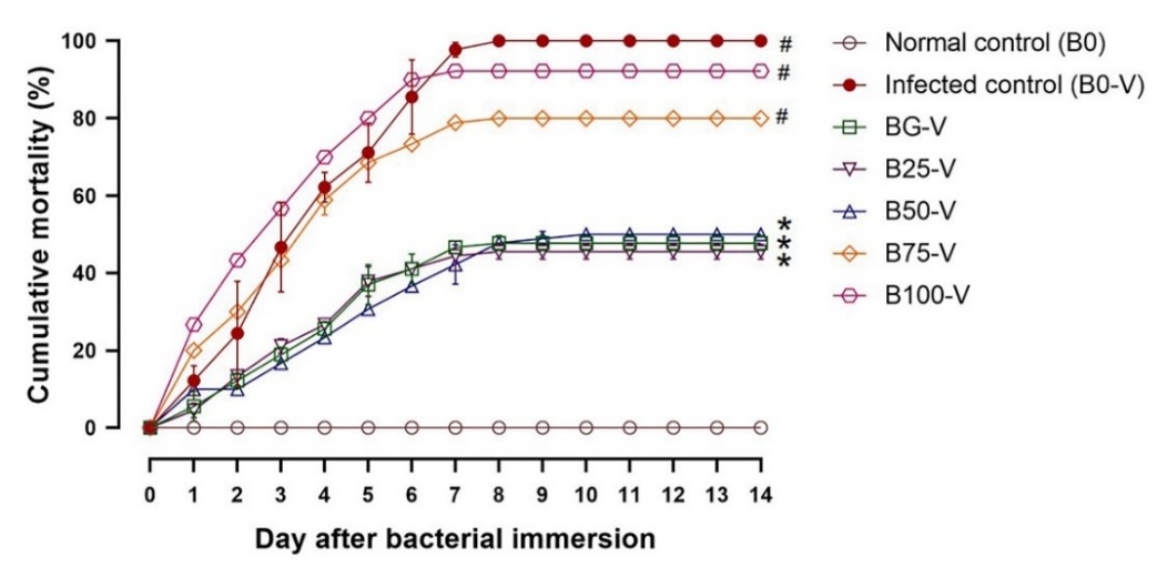 On day 1 following V. harveyi immersion, all infected groups began to show signs of mortality, whereas the normal control (B0) shrimp remained 100% alive. However, the B25-V, B50-V, and BG-V groups demonstrated lower mortality rates compared to the infected control (B0-V), as well as the B75-V and B-100-V shrimp, across all observed time points.