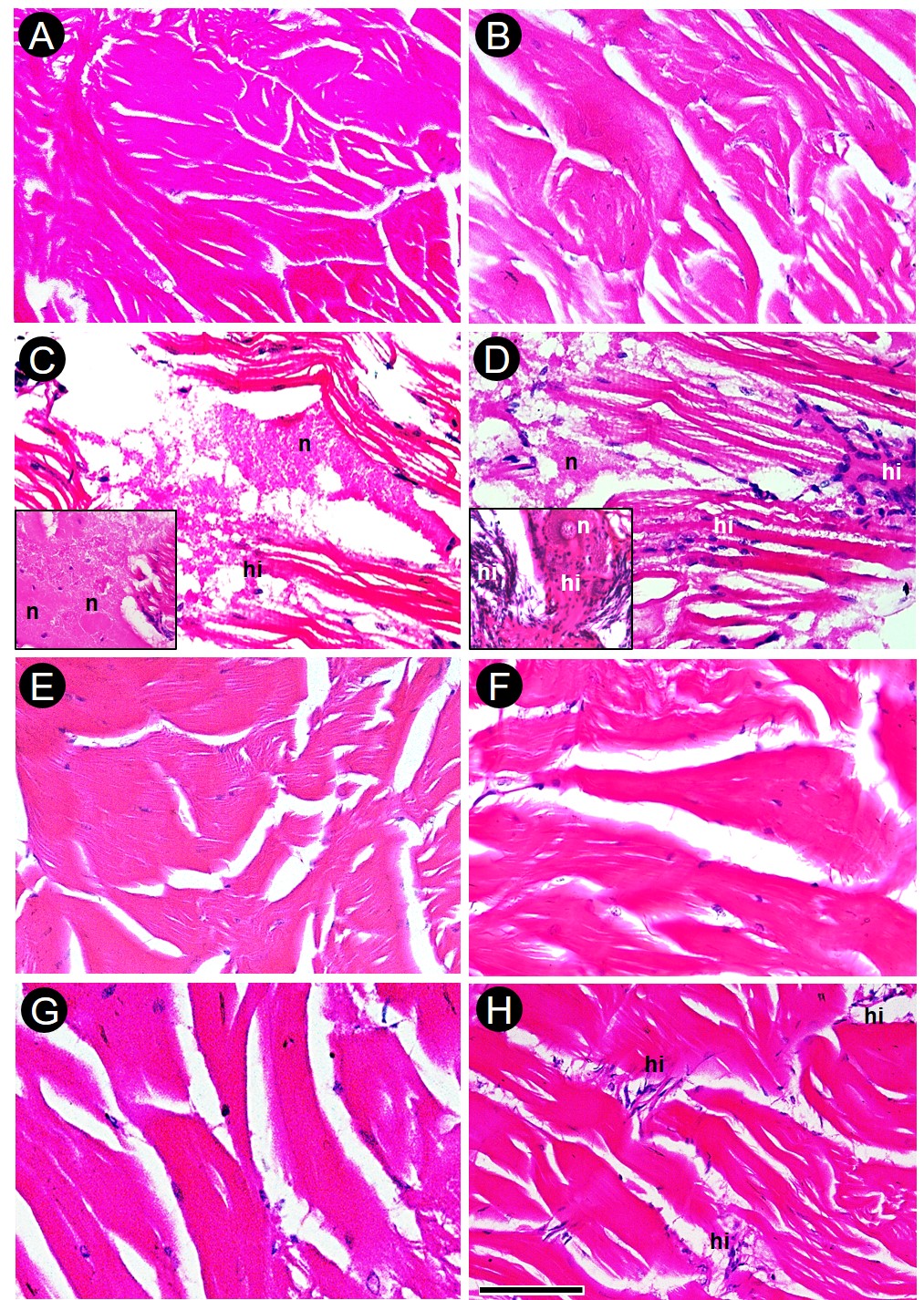 Figure 3 Photomicrographs illustrating the skeletal muscle of shrimp after immersion in V. harveyi (VH1114). Oblique sections of skeletal muscles in (A) control, uninfected shrimp (B0) and in (B) BG-V, (C) B25-V, and (D) B50-V shrimp displaying normal muscle features. (E) and (F) Transverse sections of skeletal muscle in B0-V shrimp showing muscle damage, necrotic muscle fibers (n), and haemocyte infiltration (hi). (G) and (H) Longitudinal sections of skeletal muscles in B75-V and B100-V shrimp exhibiting both (G) areas with normal muscle features and (H) areas with muscle damage and haemocyte infiltration. Scale bar = 50 µm.