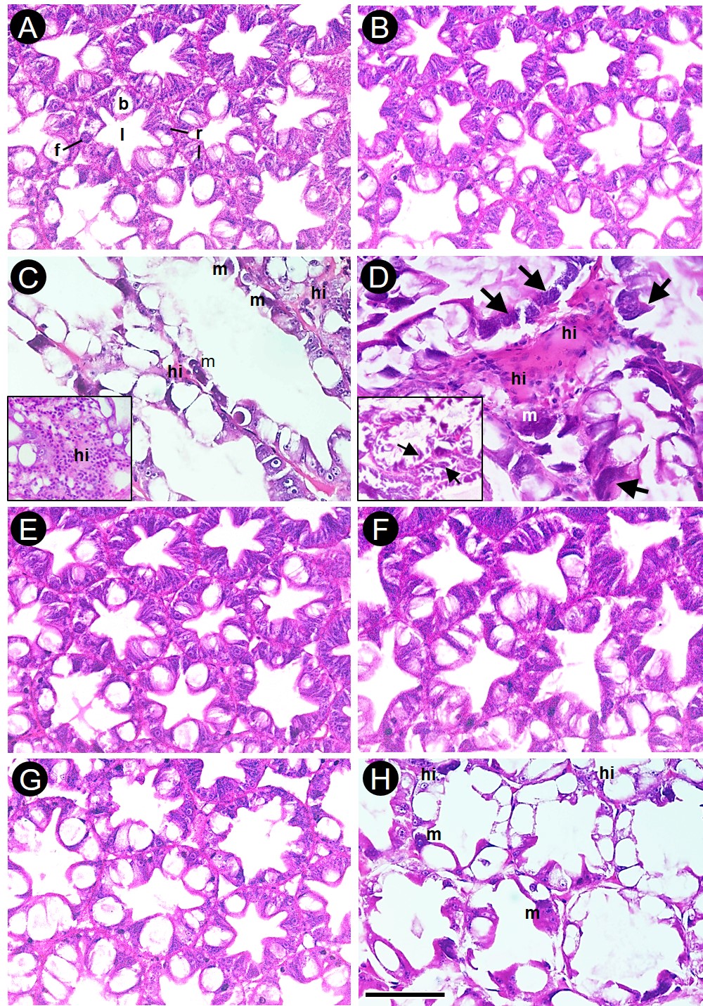 Figure 2 Photomicrographs depicting the hepatopancreas of shrimp after immersion in V. harveyi (VH1114). (A) Control uninfected shrimp (B0) and (B), (C), (D) BG-V, B25-V, and B50-V shrimp displayed normal features of hepatopancreatic tubules, with characteristic b (blister-like), f (fibrillar), and r (resorptive) cells surrounding the l (lumen). (E) and (F) Hepatopancreatic tissues of B0-V shrimp exhibited tubule destruction, melanized necrotic cells (m), haemocyte infiltration (hi), hepatopancreatic epithelium collapse, and severe sloughing of HP tubule epithelial cells (arrows). B75-V and B100-V shrimp displayed both (G) areas with normal hepatopancreatic features and (H) areas with melanized necrotic cells, haemocyte infiltration, and hepatopancreatic epithelium collapse. Scale bar = 50 µm.