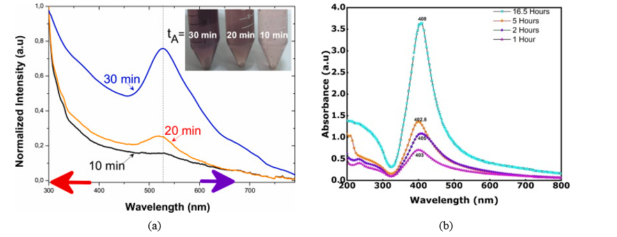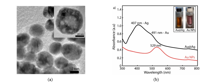 Figure 3 (a) Morphological and (b) optical properties of Au@Ag NPs synthesized using bottom-up approach [9].