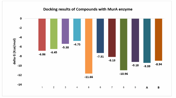 Figure 6 Graph of binding affinity (∆G) values between compounds (1-9), apigenin (A), chlorhexidine (B) with MurA enzyme.