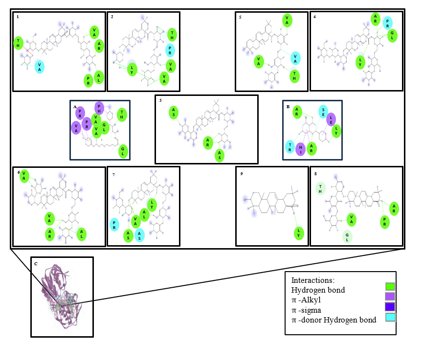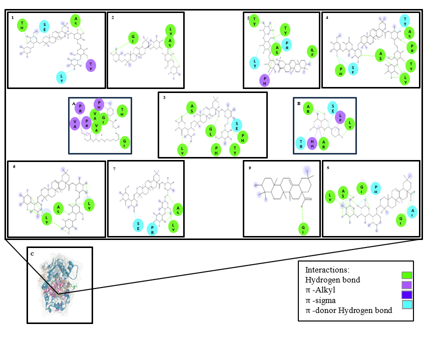 Figure 8 2D visualization of docking results of Anhuienoside E (1), Anhuienoside D (2), Anhuienoside C (3), Anhuienoside F (4), Cussonoside B (5), Flaccidoside II (6), Flaccidoside III (7), their derivatives (9), Oleanolic acid (9), Chlorhexidine (A), Apigenin (B) docked with MurA and 3D visualization (C).