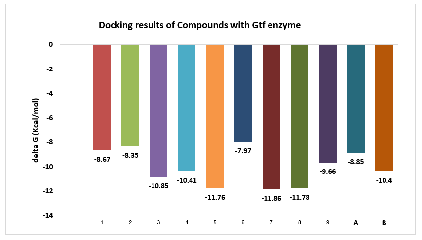 Figure 7 Graph of binding affinity (∆G) values between compounds (1-9), apigenin (A), chlorhexidine (B) with Gtf enzyme.