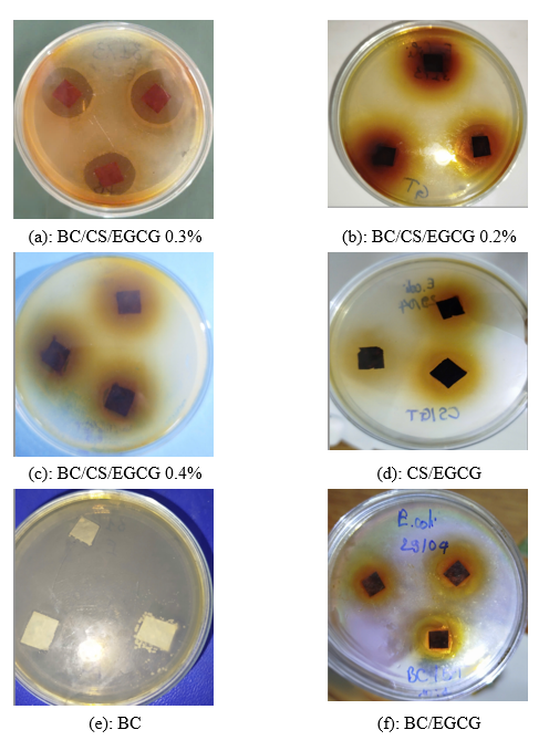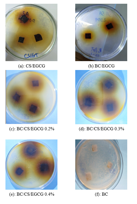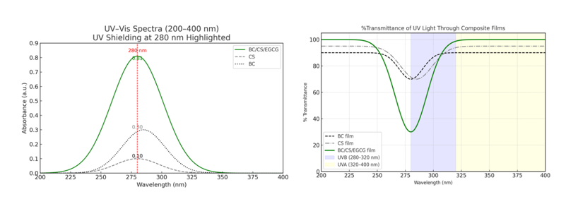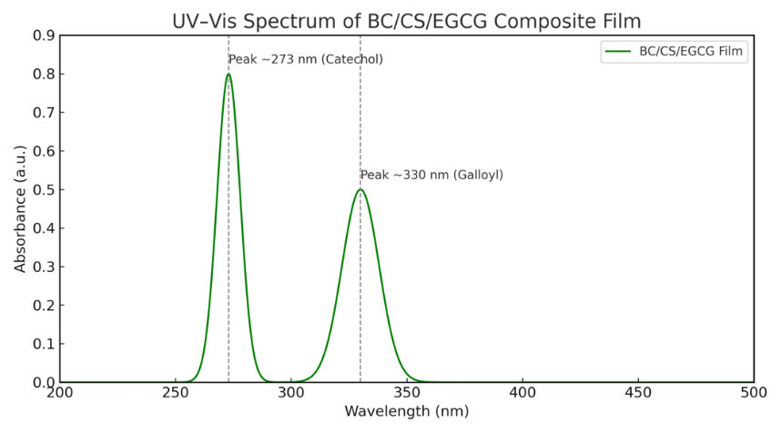 These findings confirm that EGCG not only functions as an active antioxidant and antibacterial agent but also as a structural enhancer and optical sensor within the biopolymer matrix. This work highlights the promising application prospects of BC/CS/EGCG films in: