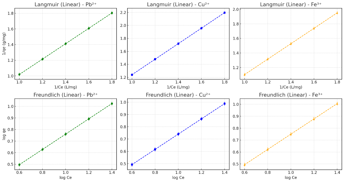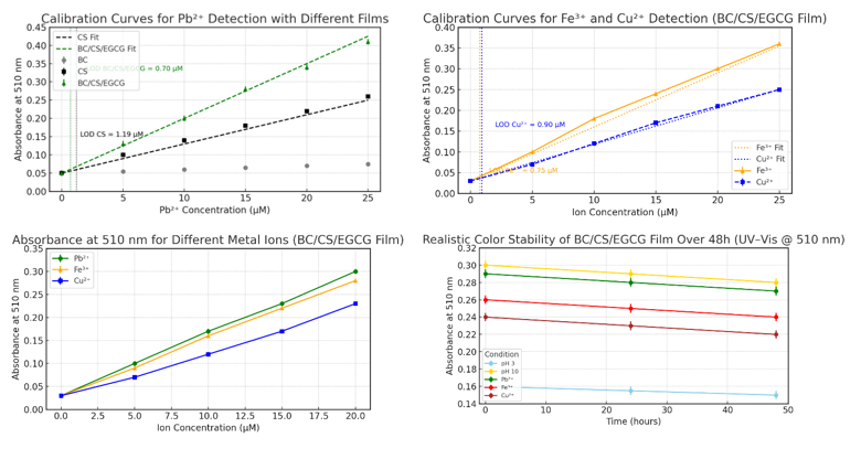 Colorimetric detection of Pb²⁺, Cu²⁺, and Fe³⁺ ions was evaluated by exposing films to metal ion solutions and monitoring absorbance changes at 510 nm. Adsorption isotherms were constructed using batch adsorption tests, and data were fitted to the Langmuir and Freundlich models to determine maximum adsorption capacities (qₘₐₓ) and adsorption constants (K_L, n).