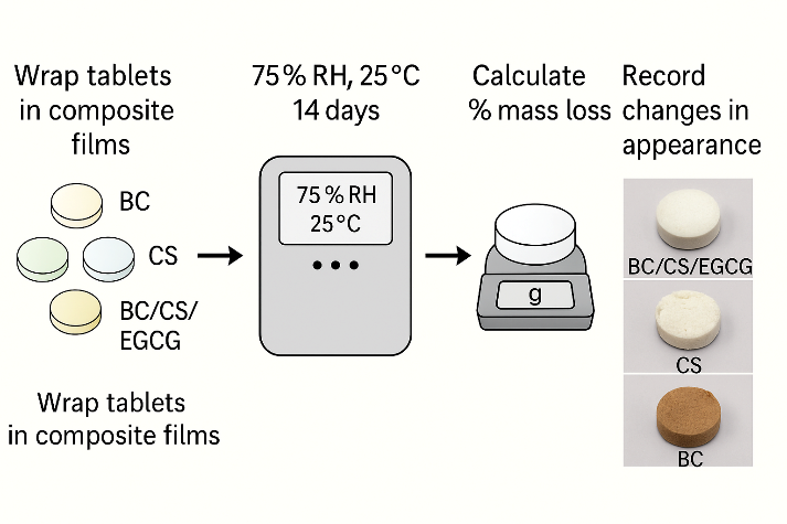 Figure 2 illustrates the experimental workflow designed to evaluate the moisture barrier performance of different composite films-specifically films based on bacterial cellulose (BC), chitosan (CS), and their combination with EGCG (BC/CS/EGCG)-by monitoring the stability of tablets under high humidity conditions. In this test, tablets were wrapped individually in each type of film and then stored in a controlled humidity chamber at 75% relative humidity (RH) and 25 C for a period of 14 days. After incubation, the percentage of mass loss from each tablet was calculated using a precision balance to assess moisture permeability. Additionally, changes in the visual appearance of the tablets were recorded to observe any physical degradation or color changes. As depicted in the right-hand panel, the tablet wrapped with BC/CS/EGCG film retained its original appearance best, while the tablet wrapped with pure BC film exhibited the most pronounced discoloration and degradation, indicating poor moisture resistance. The chitosan (CS) film showed intermediate performance.